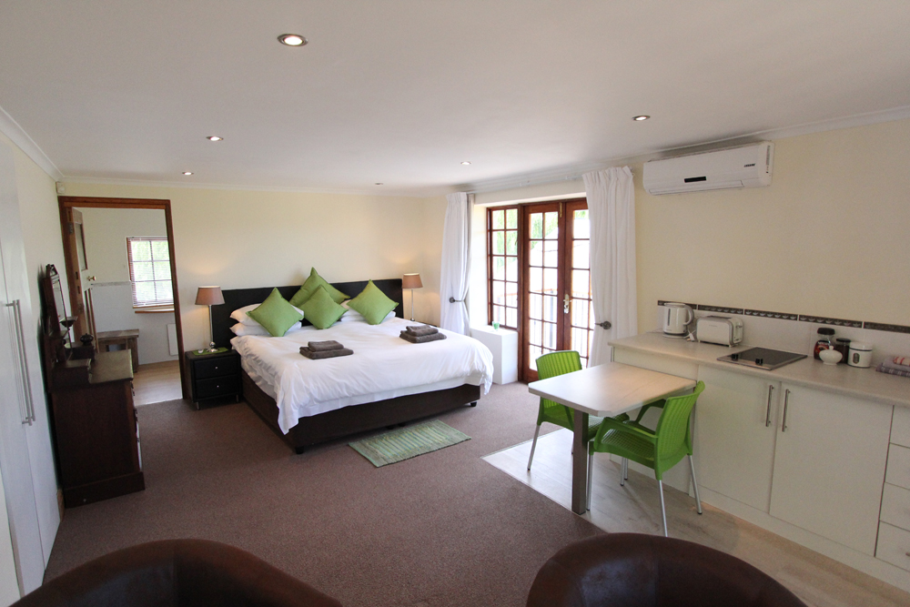 The Jacaranda suite has a King bed (extra length), fully equipped kitchenette and bathroom with shower. There is also a large flat-screen television, wireless internet and an airco unit. Under-floor heating throughout the suite will keep you warm during cooler evenings, and the bathroom also has a heated towel rail.